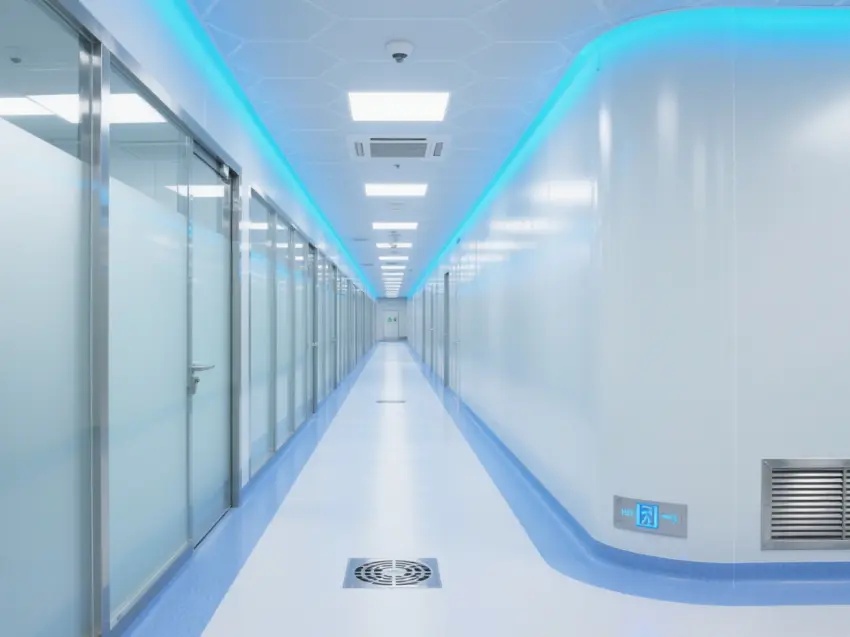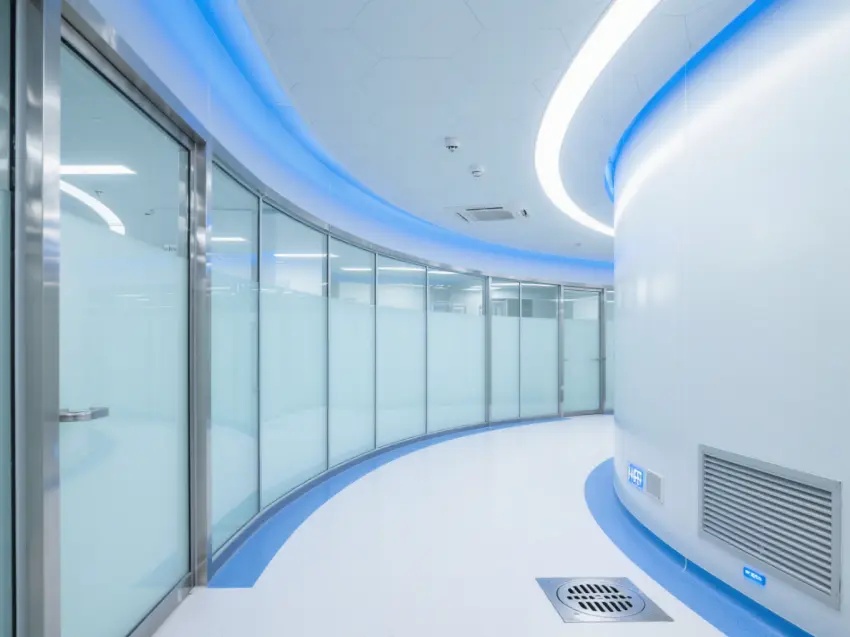 整個車間以白色為主色調,搭配藍色的燈光裝飾,營造出一種干凈、專業且略帶科技感的氛圍。地面和墻面都采用了光滑的材質,便于清潔和保持衛生。