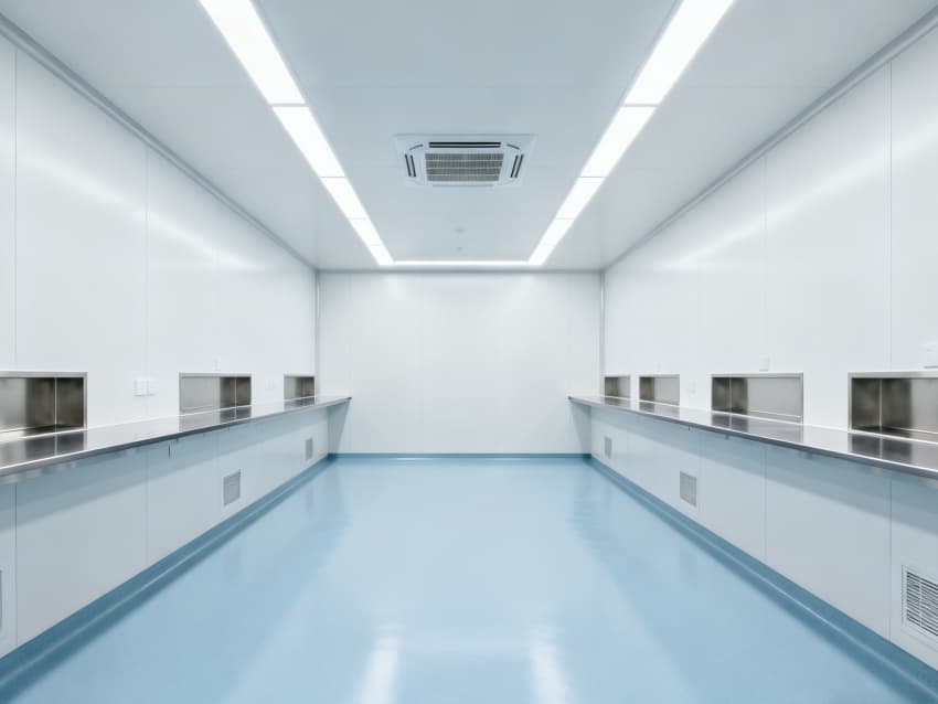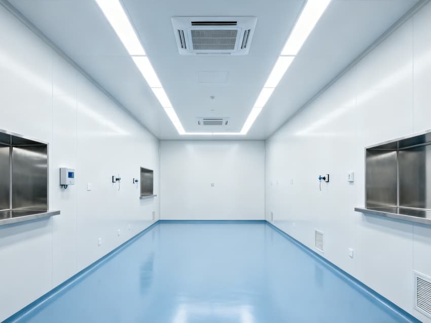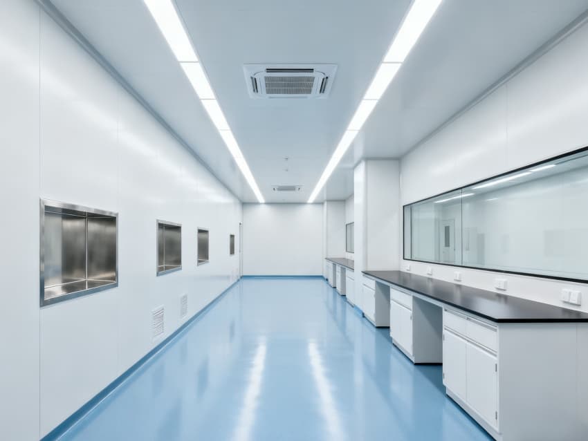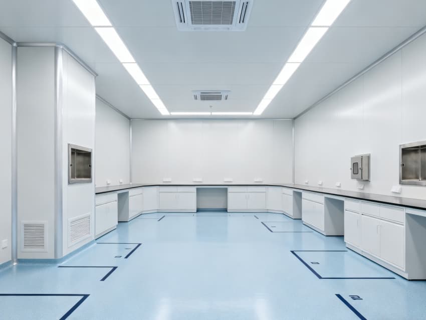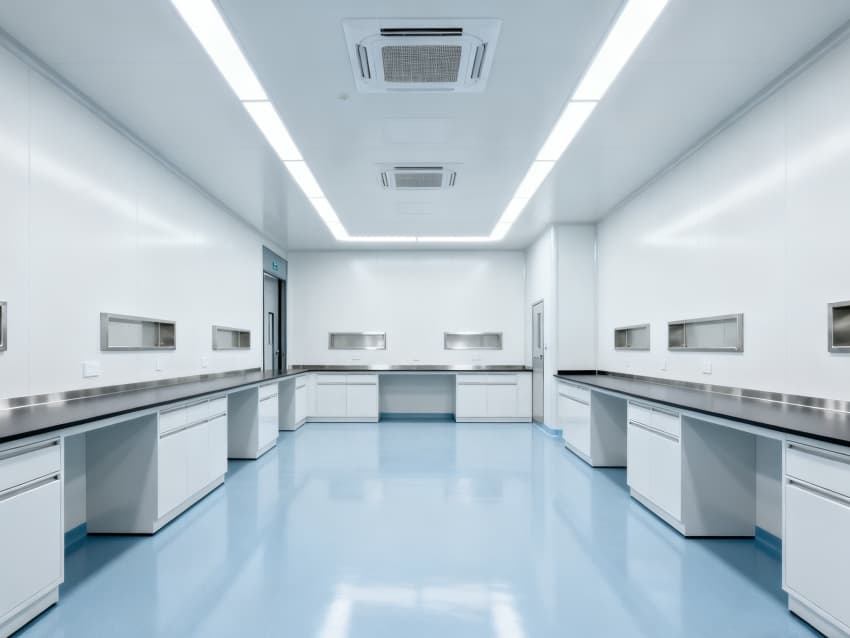 內(nèi)部6個實驗室均為無設(shè)備空曠布局,按萬級潔凈標(biāo)準(zhǔn)建設(shè):地面鋪設(shè)無縫抗菌環(huán)氧自流平,墻面采用食品級不銹鋼潔凈墻板,陰陽角做R40圓弧處理杜絕積塵死角;柱網(wǎng)間距設(shè)為7.5米,預(yù)留實驗臺、精密檢測設(shè)備安裝點位及運維通道;頂部整合高效新風(fēng)過濾系統(tǒng)、恒溫恒濕裝置與防眩光LED照明,所有管線暗藏于吊頂內(nèi),最大化釋放空間高度與視野;實驗室間通過通透玻璃隔斷銜接,進(jìn)一步強(qiáng)化整體空曠感,為藥物合成、質(zhì)量檢測等核心研發(fā)環(huán)節(jié)提供安全、潔凈的專屬環(huán)境。