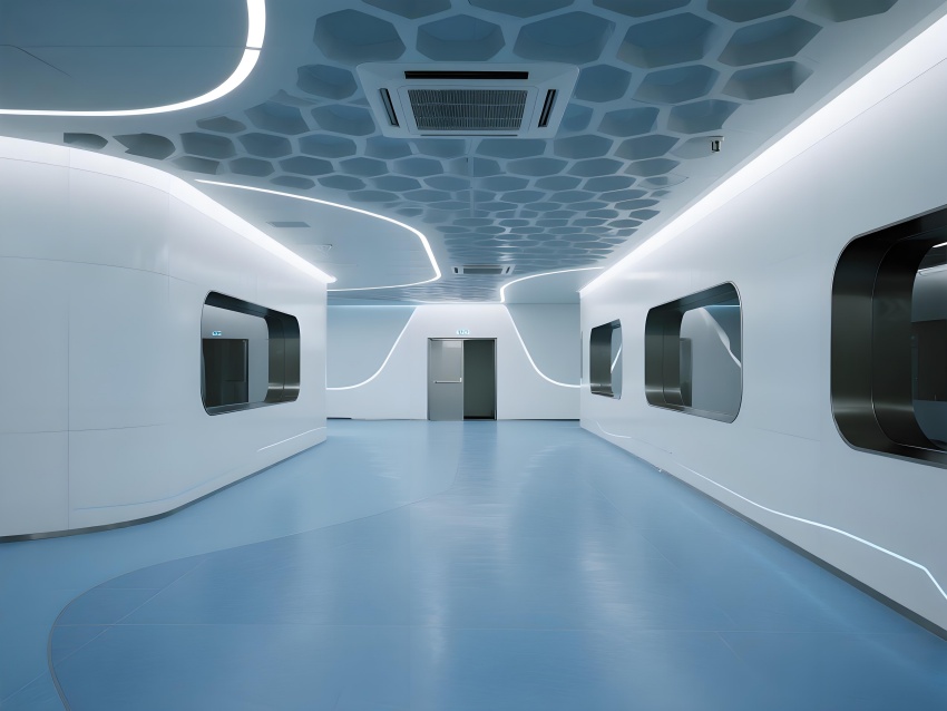 本車間空間以冰川藍與鈦白為主色調(diào),弧形墻角與無縫地坪構(gòu)成流暢的潔凈界面,頂部蜂窩狀FFU陣列形成科技感天花肌理。灌裝區(qū)透明亞克力防護罩展示自動化生產(chǎn)線運作,配合層流工作臺的紅色氣流可視化設計,強化無菌核心概念。功能模塊通過地面灰色導視帶串聯(lián),設備區(qū)的鏡面不銹鋼與控制面板的藍色背光形成冷調(diào)光效。玻璃觀察窗嵌入電子壓差計,走廊的漸變光環(huán)境引導系統(tǒng)在滿足GMP動態(tài)監(jiān)測要求的同時,營造出未來實驗室般的專業(yè)氛圍,緩解員工長時間密閉作業(yè)的疲勞感。