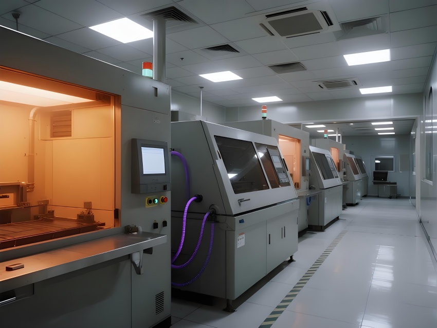 本芯片廠采用"硅基未來主義"設(shè)計(jì)風(fēng)格,將納米級(jí)制造的精密感轉(zhuǎn)化為宏大的工業(yè)美學(xué)。空間以鈦銀與深空灰為主色調(diào),光刻區(qū)的琥珀色防霧照明與蝕刻區(qū)的冷紫工藝氣體管道形成科技光譜。高架地板下的藍(lán)色氣流指示燈模擬集成電路紋路,天花板的矩陣式FFU單元如晶圓陣列般規(guī)整。透明設(shè)備艙內(nèi)機(jī)械臂的精準(zhǔn)運(yùn)動(dòng)軌跡,與墻面懸浮的晶圓生產(chǎn)數(shù)據(jù)流構(gòu)成動(dòng)態(tài)敘事。防靜電涂層的金屬質(zhì)感表面反射出潔凈室的無限縱深感,關(guān)鍵區(qū)的紅色激光定位光幕則強(qiáng)化半導(dǎo)體制造的危險(xiǎn)與精確。通過嚴(yán)格的功能色彩編碼(黃-光刻/紫-蝕刻/藍(lán)-檢測)和極簡的無縫設(shè)計(jì),在滿足ISO14644Class1標(biāo)準(zhǔn)的同時(shí),塑造出如同微觀芯片放大至建筑尺度的震撼視覺隱喻。