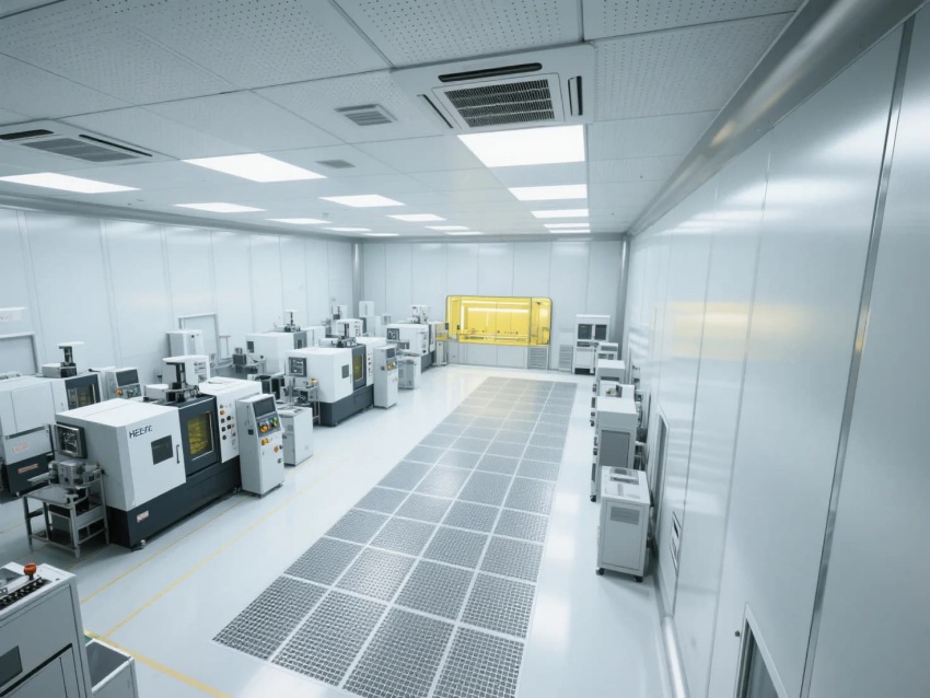 模塊化功能單元:劃分微米級加工區(黃光照明)、光學檢測區(黑箱設計)、物料緩存區(負壓隔離)