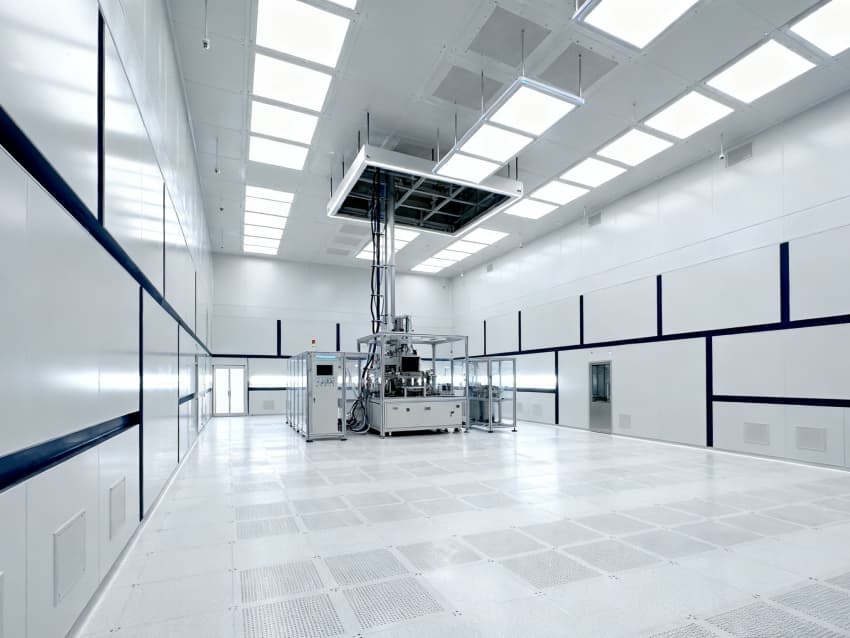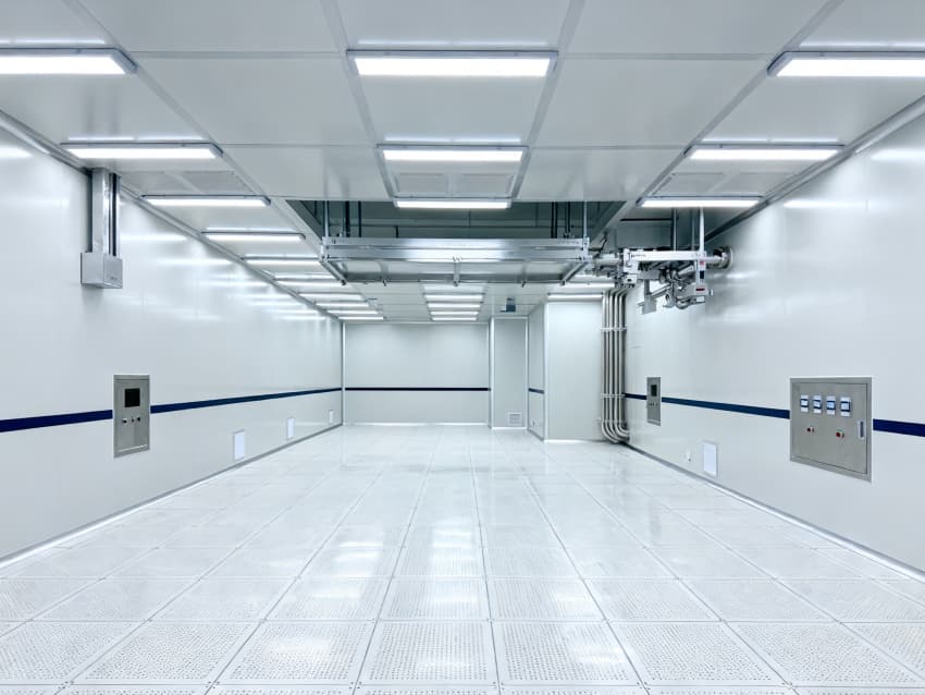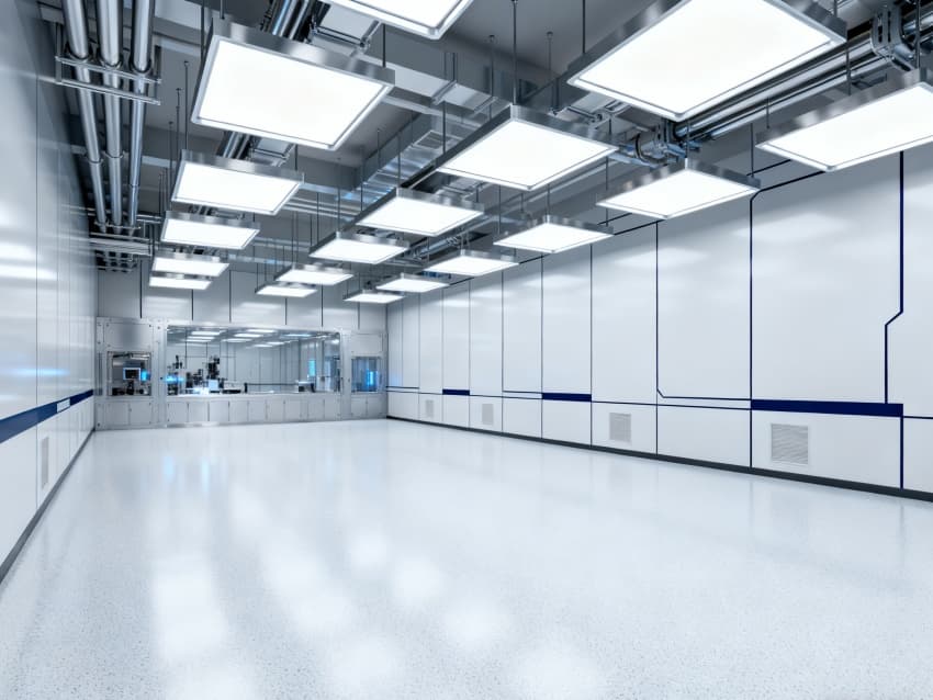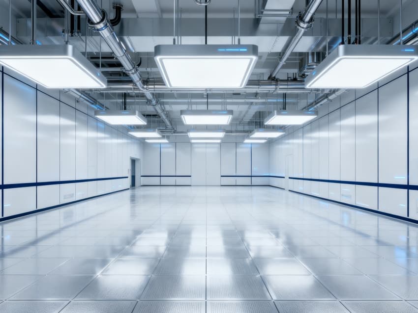 內(nèi)部6個量子車間均為無設(shè)備空曠布局,按千級潔凈標(biāo)準(zhǔn)與防電磁干擾要求建設(shè):地面鋪設(shè)防靜電環(huán)氧自流平,墻面采用無磁不銹鋼潔凈板,陰陽角做R50圓弧處理;柱網(wǎng)間距設(shè)為8米,預(yù)留充足設(shè)備安裝與運(yùn)維空間;頂部整合恒溫恒濕系統(tǒng)、高效送風(fēng)口及防眩光LED照明,設(shè)備管線暗藏設(shè)計(jì),進(jìn)一步強(qiáng)化空間空曠感,為量子芯片測試、量子傳感研發(fā)等場景提供穩(wěn)定、潔凈的專屬環(huán)境。