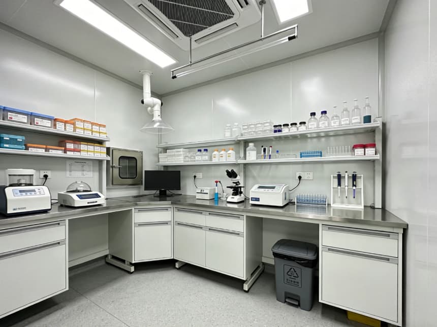 內部檢測空間均以淺灰色耐磨地坪搭配白色無縫潔凈墻面,視覺整潔且適配檢測核心需求。淺灰色地面選用高硬度環氧材質,抗壓耐磨、抗污易清潔,可耐受檢測過程中各類試劑殘留與設備搬運磨損;白色墻面采用環保抗菌涂層,平整度高、反光均勻,搭配嵌入式防眩光照明,為精密檢測提供清晰穩定的視覺環境,減少誤差干擾。