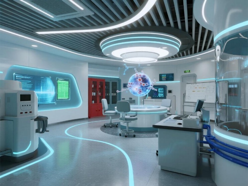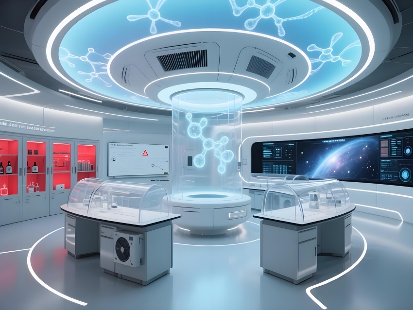 本實驗室宛如一座精密運轉的"環(huán)境圣殿",以"絕對環(huán)境控制"為靈魂信條。冰川藍與鈦白灰的漸變墻面如同極地冰原與金屬穹頂?shù)耐昝澜蝗?,嵌入式監(jiān)測屏上躍動的翡翠綠數(shù)據(jù)流,恰似未來之泉在科技殿堂中潺潺流淌。圓弧形玻璃隔斷如同透明的生物繭房,百級潔凈層流罩在其中吐納著純凈氣流。地面鋪設的防靜電陶瓷鋼板閃爍著冷冽光澤,接縫處的LED指示燈如同守衛(wèi)環(huán)境標準的哨兵。銀色保溫管道與藍色冷媒管在設備區(qū)交織出工業(yè)交響曲,智能除濕機組半透明的外殼里,冷凝過程正在上演一場液態(tài)芭蕾。數(shù)據(jù)中控室270°曲面屏上,懸浮粒子濃度化作璀璨星云流轉。整個空間以幾何的嚴謹與流體的靈動共舞,在科研的圣殿里譜寫出一曲星際交響詩。