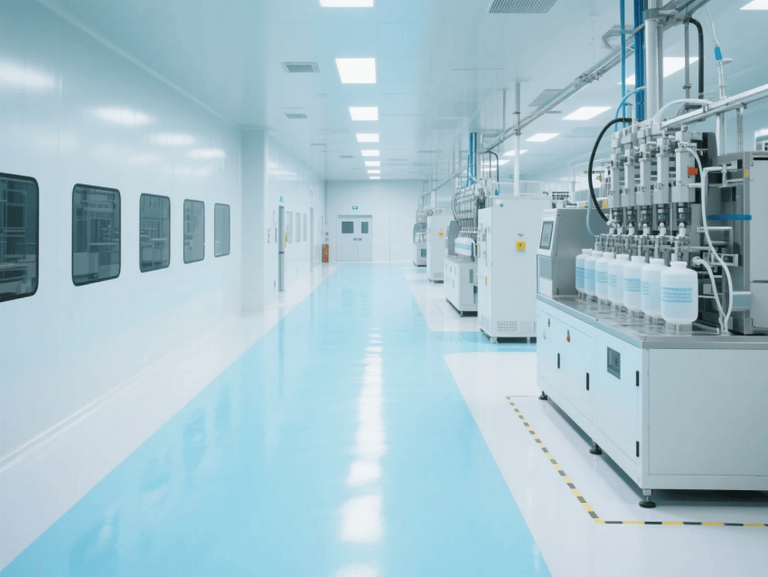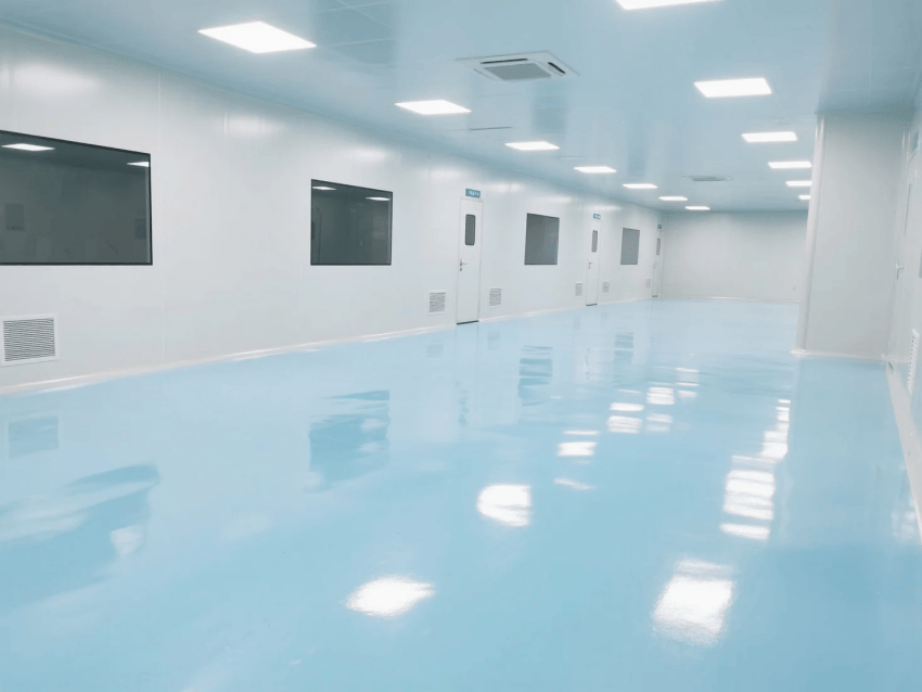 本方案嚴格遵循ISO14644-1Class7潔凈標準,采用淺藍色彩鋼板與啞光白環氧樹脂構建主體空間,打造兼具科技美感與功能性的生產環境。圍護系統選用50mm厚抗菌彩鋼板,表面經特殊涂層處理,具有優異的防塵抗靜電性能,所有接縫處采用圓弧過渡工藝處理,確保無死角清潔。