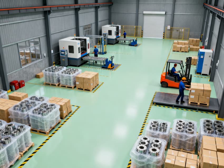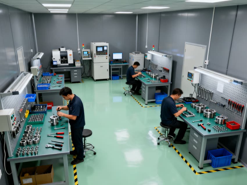 全車間統一預留標準化電源接口、壓縮空氣管路及 coolant 回收通道,層高5米適配各類大型CNC設備安裝調試。地面隱形標識清晰劃分加工區、通道區及安全區域,墻面張貼設備操作規范預留位。整體設計兼顧實用性與安全性,為精密CNC加工提供穩定、高效的生產環境,助力保障零件加工精度與生產效率。