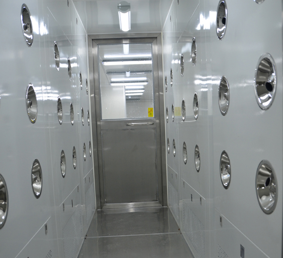 風淋室是人員進出潔凈室所必需的通道,并同時起到氣閘室密閉潔凈室的作用。為了減少由于人員進出所帶來的大量塵埃粒子,經高效過濾器過濾后的潔凈氣流由箱體兩側可旋轉噴嘴噴射至人/貨表面,有效而迅速清除塵埃粒子,清除后的塵埃粒子再由初、高效過濾器過濾后重新循環到風淋區域內。為了達到吹淋的最佳效果,風淋室設計的噴嘴出風口風速能達到18-22m/s以上,吹到人身上的風速最低18m/s,出廠的初始風淋時間設置為10秒。