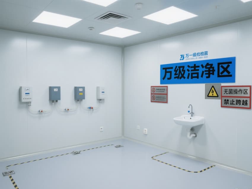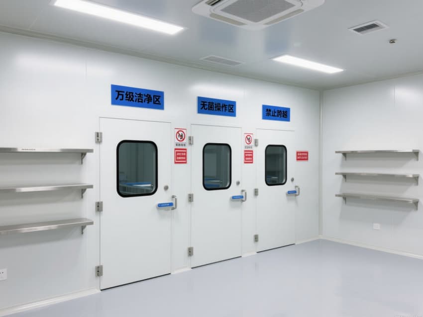 空間內(nèi)配備不銹鋼潔凈門窗與雙扉傳遞窗,均采用高氣密性密封結(jié)構(gòu);嵌入式LED潔凈燈提供300-500lux均勻照明,無眩光設(shè)計(jì)保障操作精度。恒溫恒濕系統(tǒng)精準(zhǔn)控制溫度(20-24℃)、濕度(45-60%),藍(lán)色功能標(biāo)識(shí)線清晰劃分操作動(dòng)線,全方位營(yíng)造安全、穩(wěn)定的萬級(jí)無菌環(huán)境。