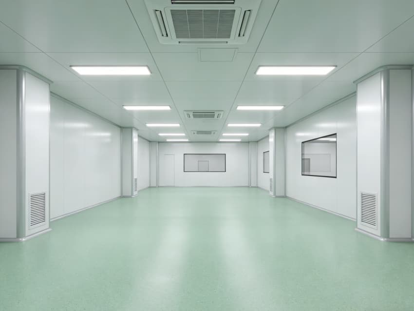車間內部施工工藝凸顯專業優勢:地面采用淺綠色環氧自流平施工工藝,經基層打磨、界面處理、環氧砂漿找平、自流平罩面四道工序,表面平整度誤差≤1mm/m,兼具抗菌、抗化學腐蝕特性;墻面采用白色潔凈抗菌涂層施工,推行無縫拼接工藝,陰陽角采用圓弧倒角處理,杜絕清潔死角,涂層附著力達1.5MPa以上,滿足頻繁消殺需求。